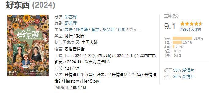 在上映之前,《好东西》在北京和上海进行了限时点映四肢。让东说念主没猜想的是,点映四肢松手后,就有近六万东说念主为《好东西》在豆瓣给出了9.1的高分。
