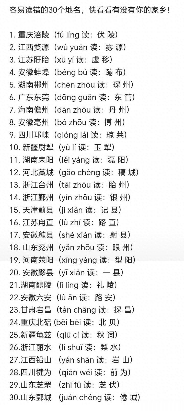 不知谈有几许一又友能把这30个地名王人读对呢?也来举下手,还有便是你们家乡有莫得容易读错的地名呢?背后又有着什么不不异的故事呢?