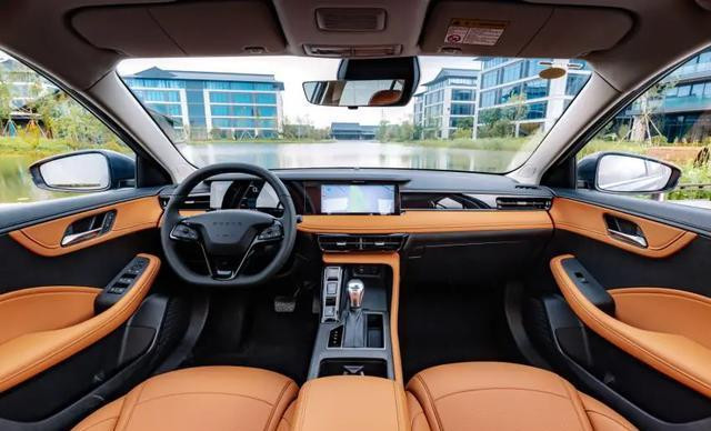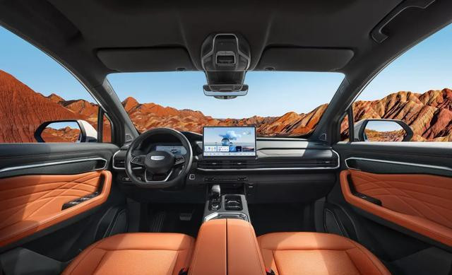 内饰有黑、浅棕两色可选,配平底三辐式多功能方针盘与工致电子挡杆。中控台搭载超长悬浮双12.3英寸联屏,含星河OS 2.0系统、“三指飞屏”及防眩光功能,科技感强。