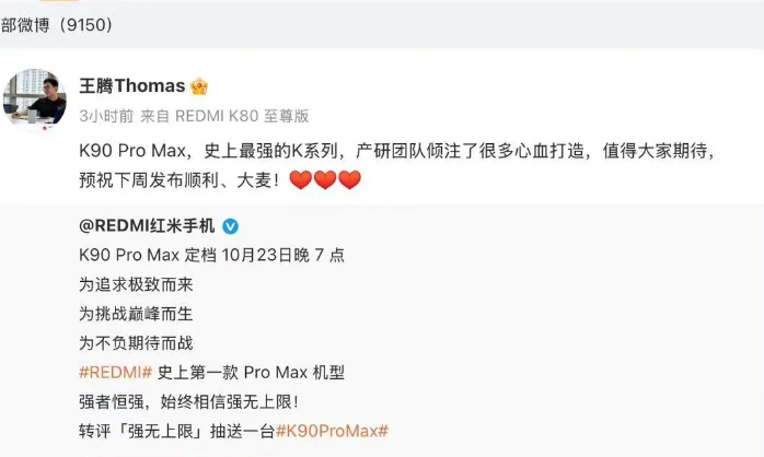 小米原中国区市集部总司理王腾于本年9月因泄密被除名。据媒体报说念,10月17日@王腾Thomas 微博转发红米手机官方推文并暗意:K90 Pro Max,史上最强的K系列,产研团队倾注了许多心血打造,值得群众期待,预祝下周发布成功、大麦!