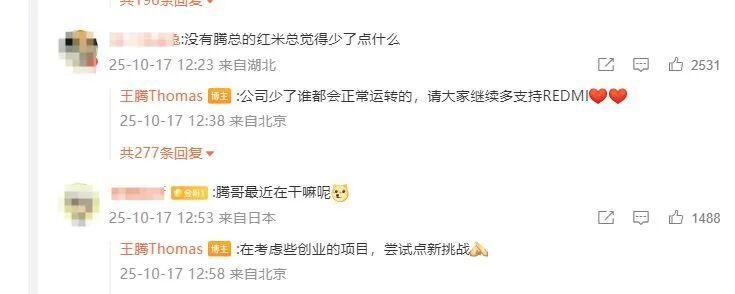 在筹商区,有网友称“莫得腾总的红米总以为少了点什么”,王腾回话称“公司少了谁王人会当年运转的,请群众持续多补助REDMI”;此外,王腾暗意最近“在探究些创业的花式,尝试点新挑战”。