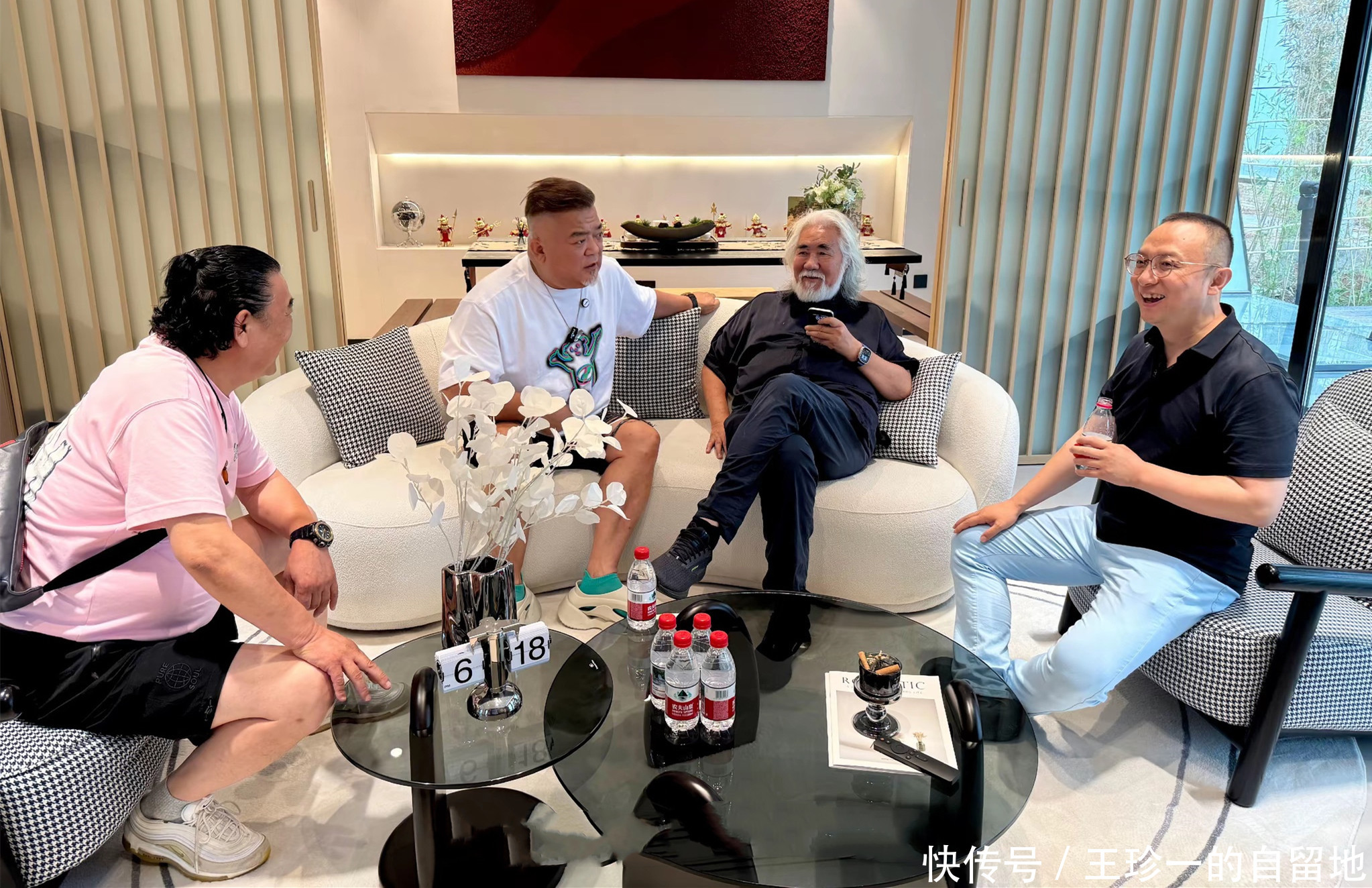 赶快张纪中庄重到捯饬哥准备了一条接待他的横幅,张纪中很繁荣,直言“不照张相不成”,说完他就呼唤捯饬哥和现场其他东谈主士沿路在接待横幅下合影。
