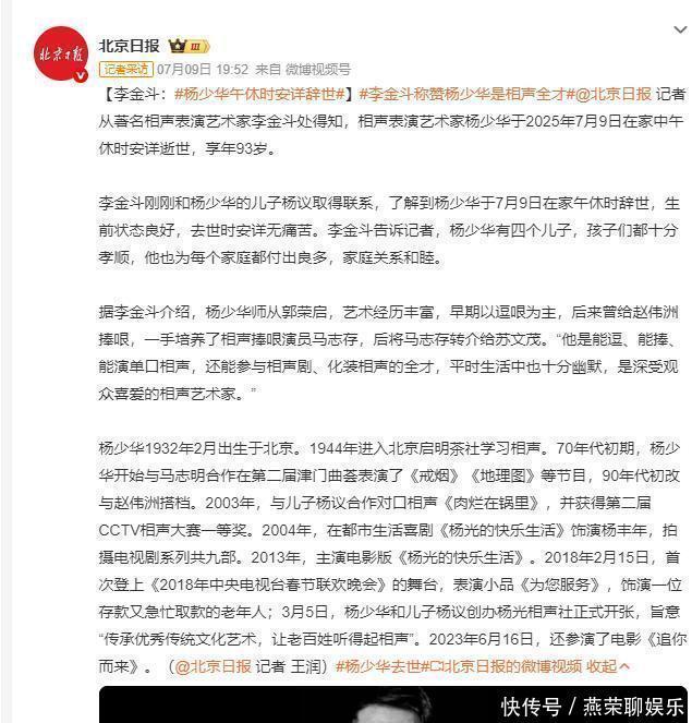 7月9号下昼,知名相声演员杨少华因为疾病不得志牺牲开云体育,对于牺牲的细节,家东说念主在接管媒体访谒时说法和李金斗的述说不太雷同,但归根结底,就两个字“出其不意”。因为在那之前,杨少华的状态和精神神情都还挺好的。