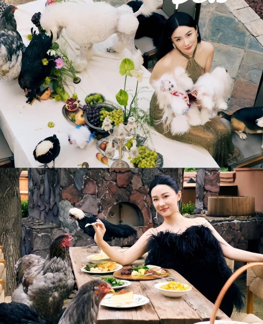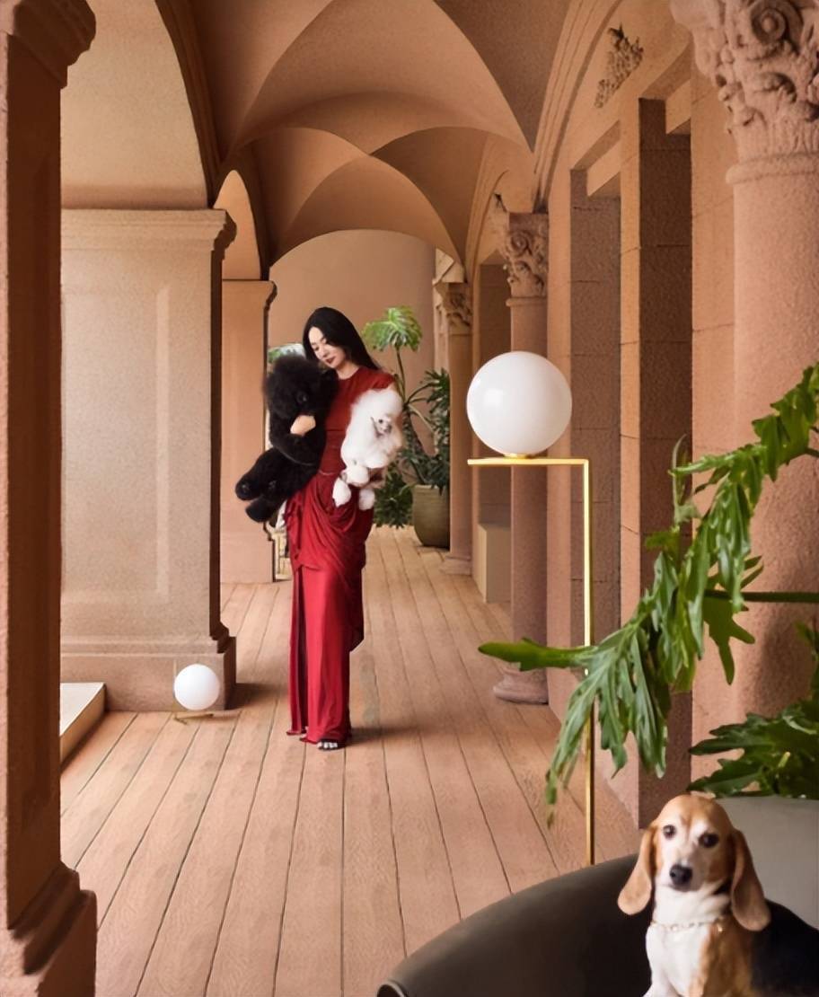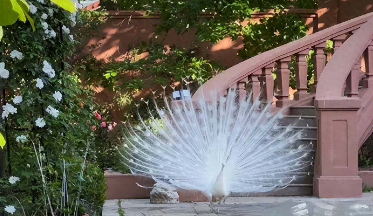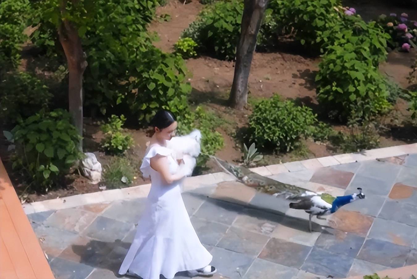 一只白孔雀在她家开屏,她穿戴白裙抱着价值十万的狗子在2000平的大院里遛弯,这画面,险些像是从童话书里撕下来的一页。