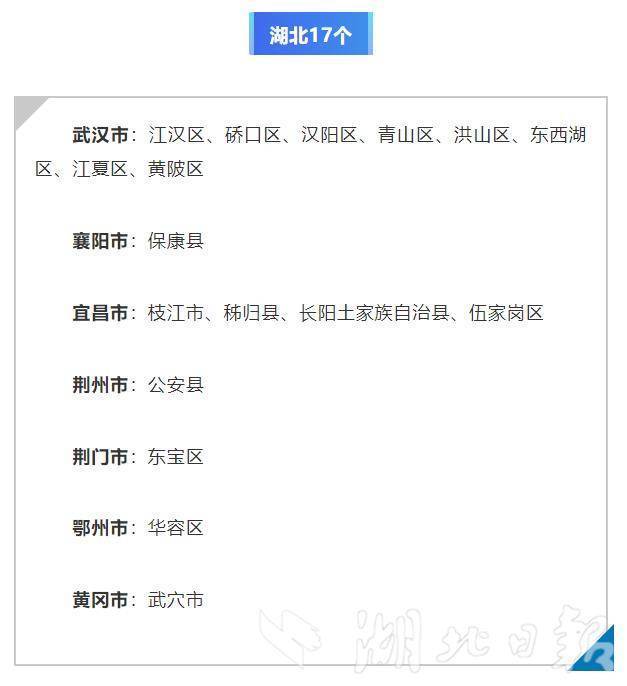 我省这次通过首批认定的地区包括:武汉市江汉区、硚口区、汉阳区、青山区、洪山区、东西湖区、江夏区、黄陂区;襄阳市保康县;宜昌市枝江市、秭归县、长阳土眷属自治县、伍家岗区;荆州市公安县;荆门市东宝区;鄂州市华容区;黄冈市武穴市。
