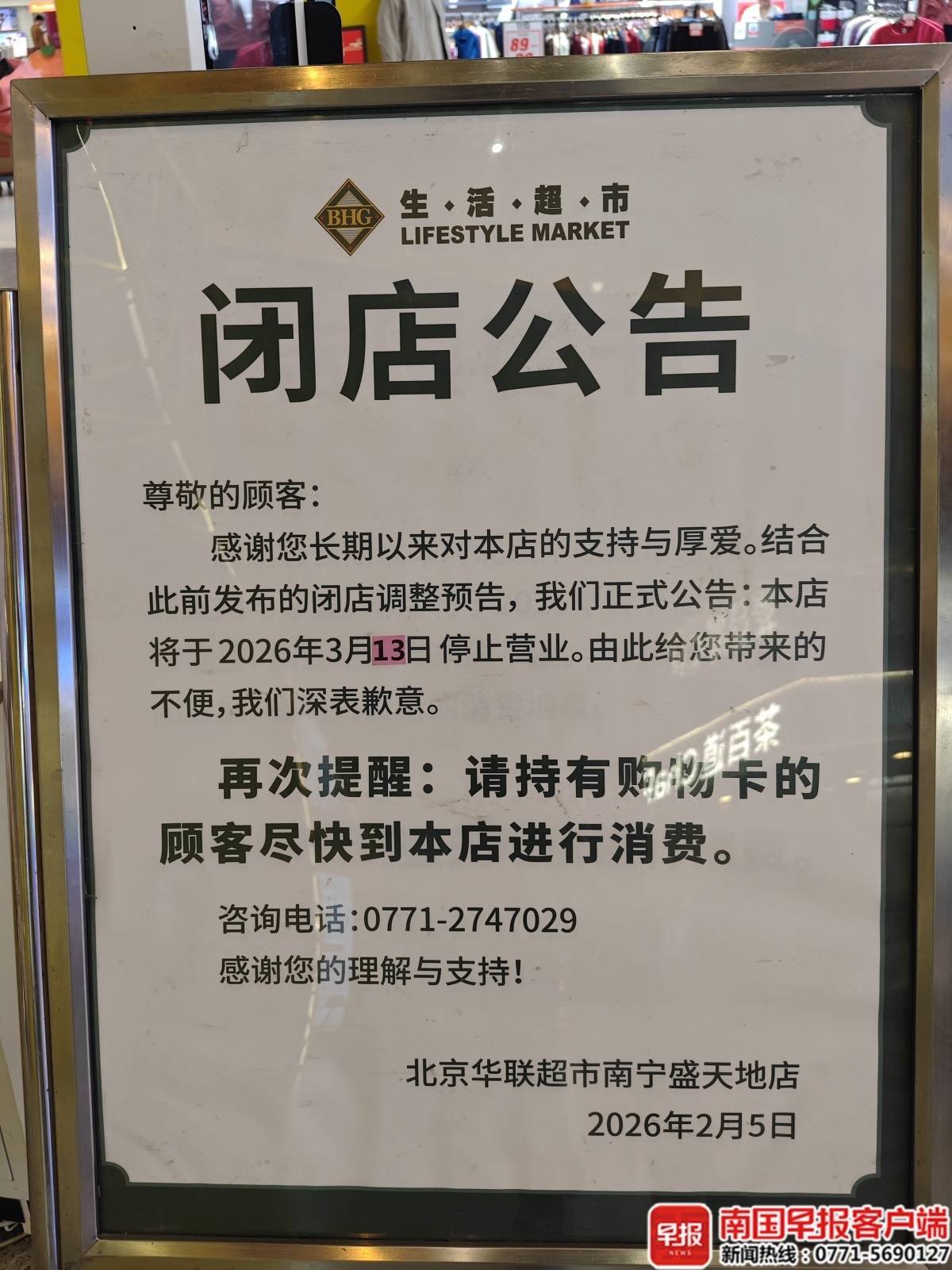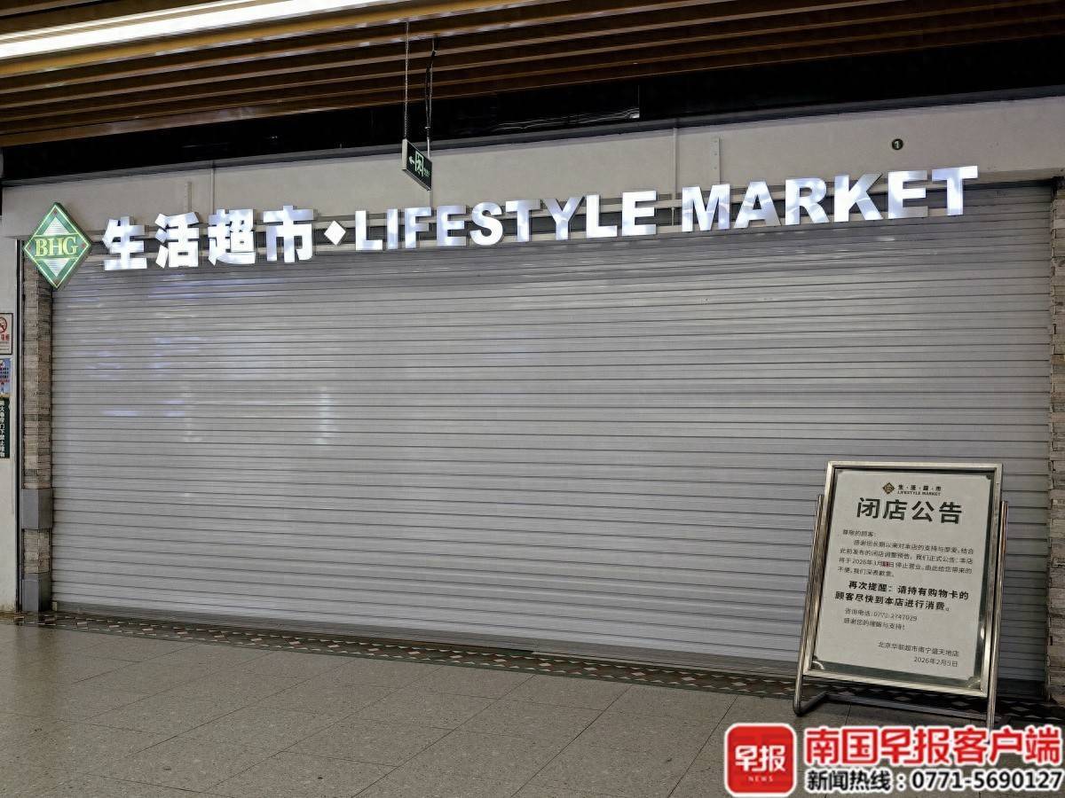 12日下昼4时许,南国早报全媒体记者来到南宁市东盟盛六合购物中心B1层,在华联超市进口处看到一则2月5日发布的闭店公告,称该店将于2026年3月13日罢手营业,提醒握有购物卡的主顾尽快到店进行破钞。